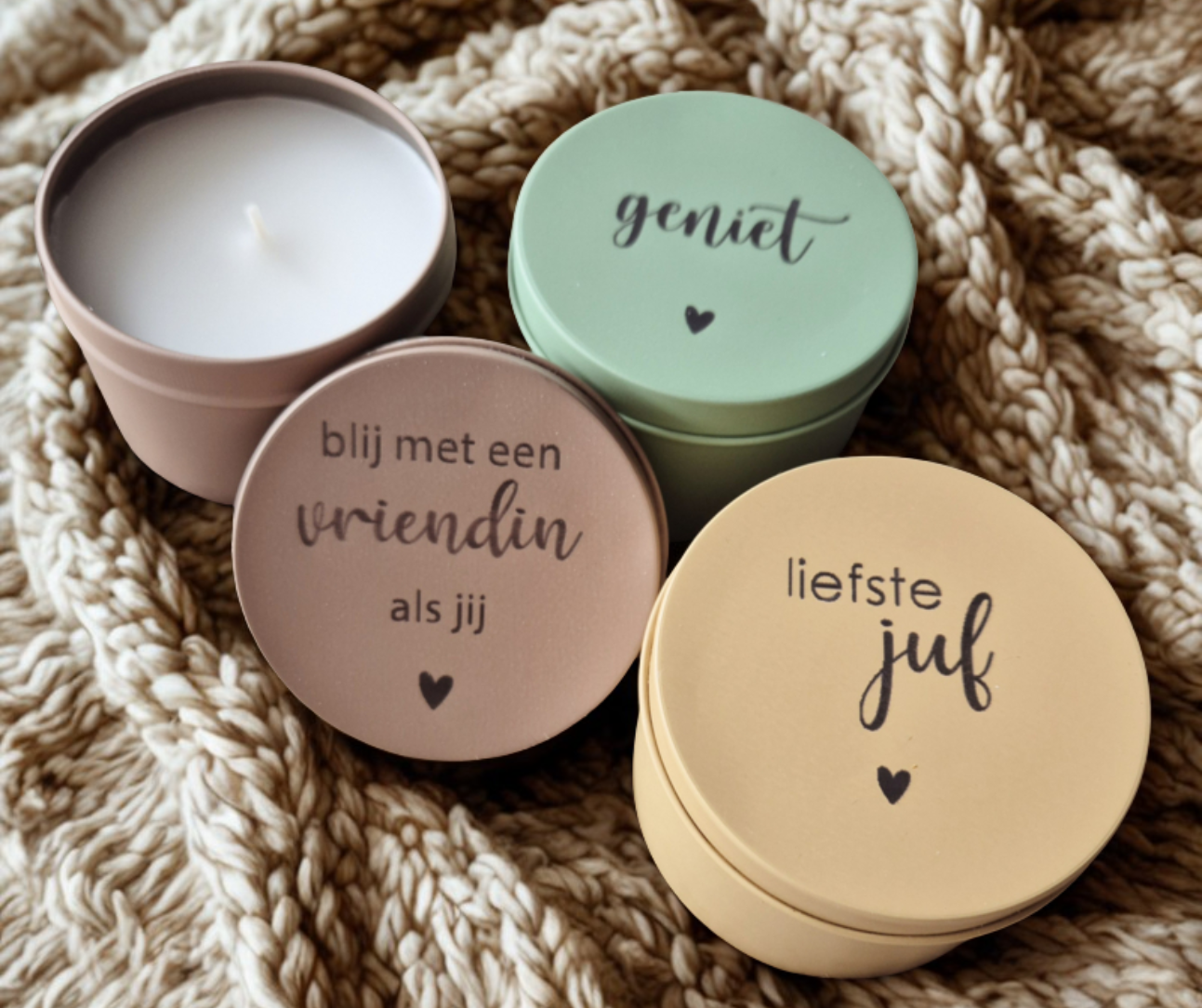 Bestel vandaag nog jouw geurkaars in blikje met tekst en geef een geschenk dat net zo uniek is als de persoon die het ontvangt.