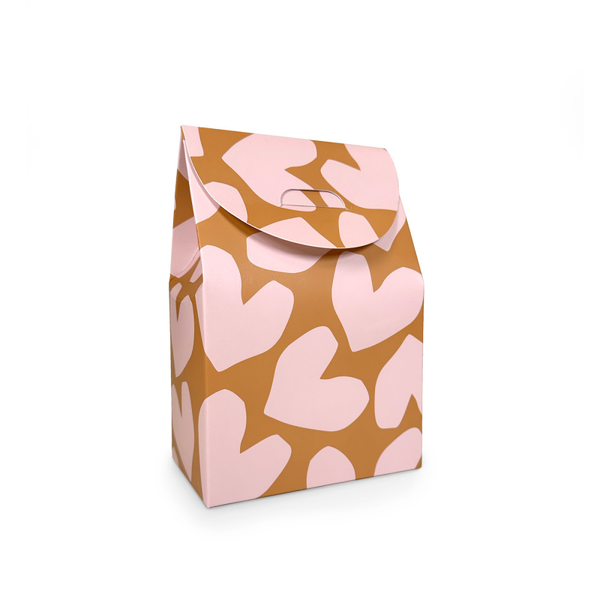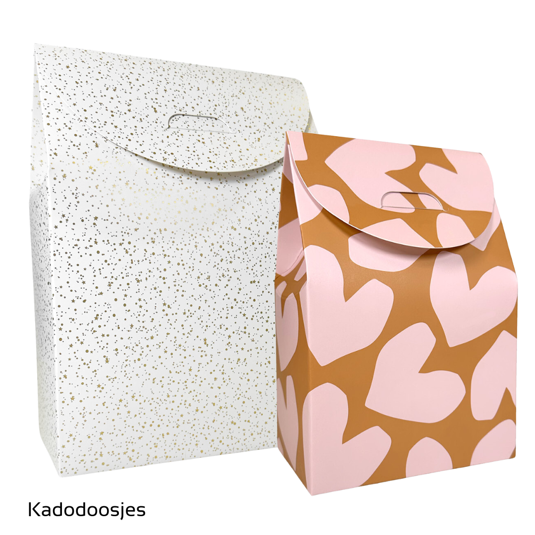 Het grootste kadodoosje is wit met een elegante gouden spikkelbedrukking en heeft een royaal formaat van 25 x 18 x 10 cm – perfect voor "grotere" kado’s. Het kleinere doosje is uitgevoerd in een warme roestkleur met een schattige hartjesprint. Dit doosje is 19,5 cm hoog, 13 cm breed en heeft een bodem van 8 cm, ideaal voor kleinere producten of accessoires.
