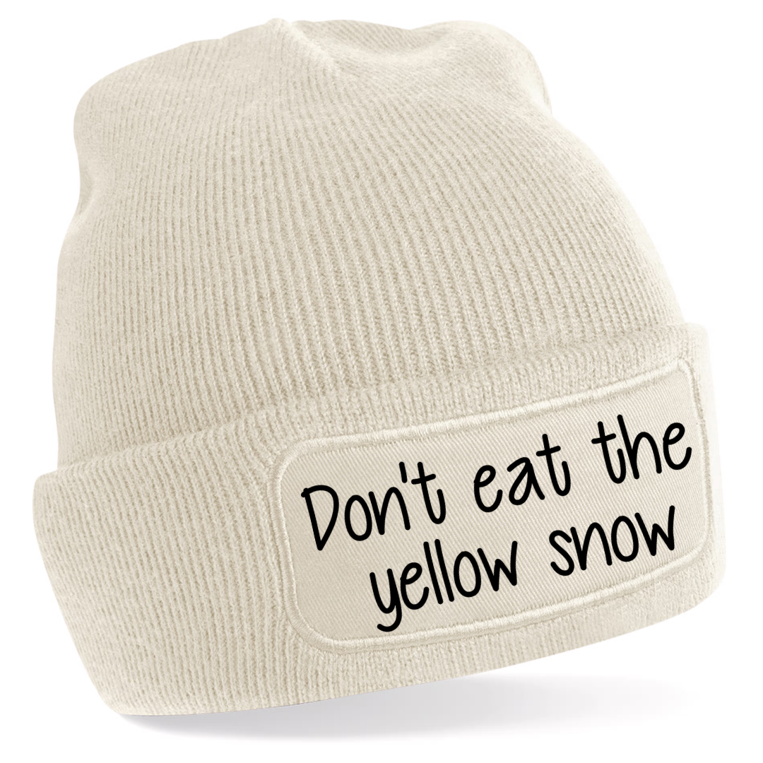 Beanie bedrukt met Don't eat the yellow snow. Trotseer de kou met deze warme wintermuts met grappige tekst. Leuk om kado te geven of om zelf te dragen.