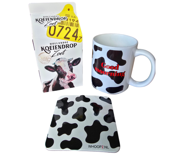 Uit te breiden met: onderzetter, mok en melkdoosje met koeiendrop